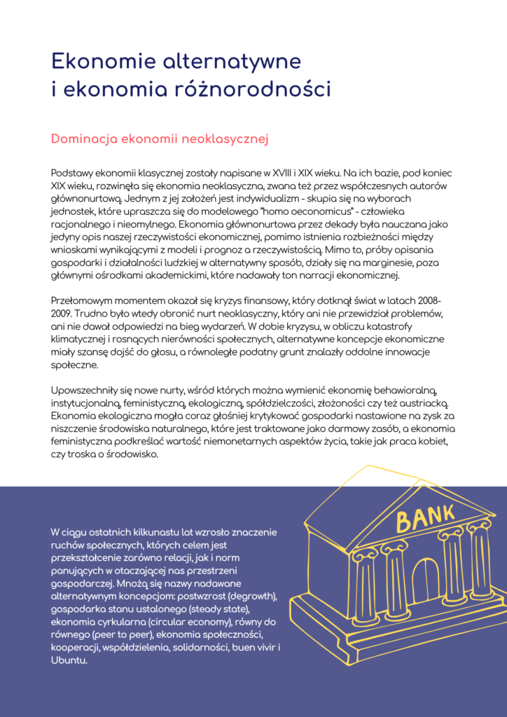 W odpowiedzi na kryzys ekonomiczny na początku XXI wieku, nastąpił rozkwit alternatywnych nurtów ekonomicznych, obejmujących zarówno modele i teorie wyjaśniające zjawiska gospodarcze, jak i koncepcje na zmianę paradygmatu myślenia i wartości wspieranych przez gospodarkę. Część 1.1 stanowi wprowadzenie do tematu.